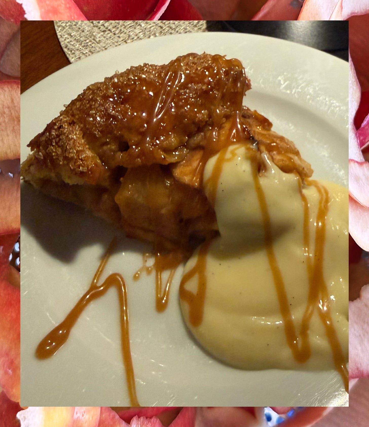 Serve. To plate, spoon some creme anglaise on top of the galette slice and drizzle with more caramel & a sprinkle of flakey salt.