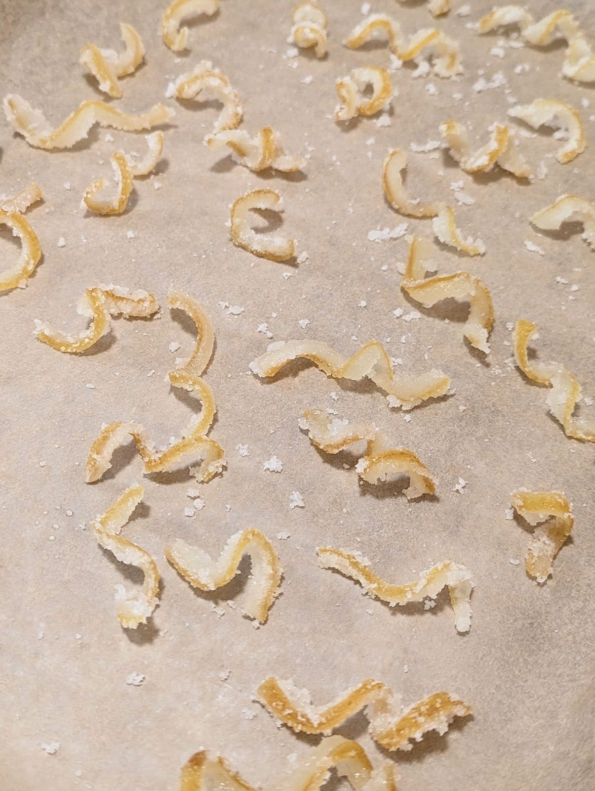 Julienne the lemon rinds into long strips and boil with water & sugar until they become translucent and soft. Remove the rinds from the water and apply sugar to coat while they’re still hot/sticky. I curled mine around chopsticks so they would be cute.