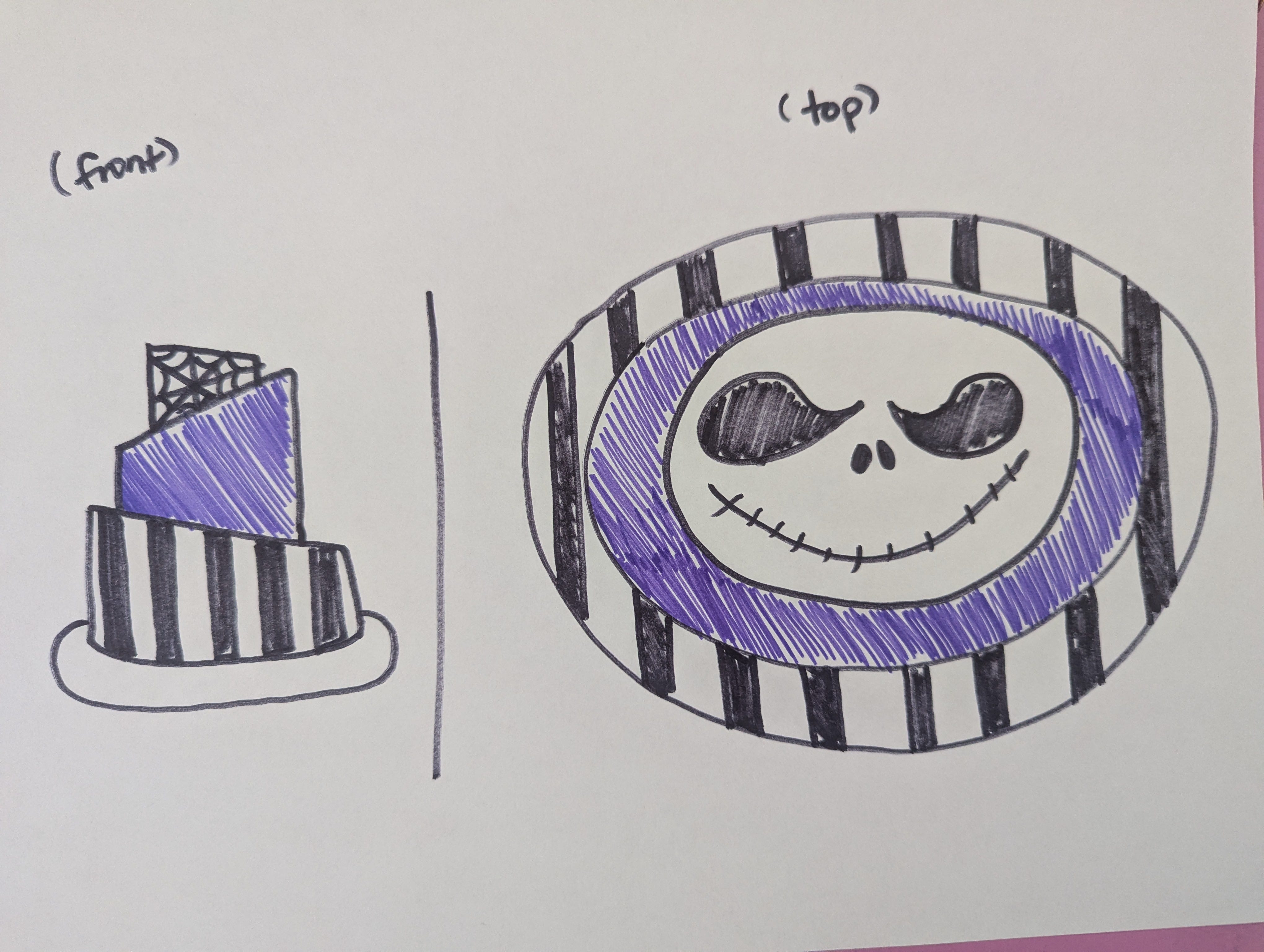 The cake had 3 layers, each covered in a fondant I made from scratch (I’ve never used fondant again because this project helped me realize that fondant, even homemade, is very bad in a myriad of ways). The colors were black (again—don’t do it), purple, and white. Each layer had a different pattern—I think one was white and black stripes, another had piped spider webs (spooky!), and the middle was a solid purple. I don’t have a picture of said physics-defying cake marvel, so here’s this excellent drawing. Needless to say it was, to this day, one of my biggest accomplishments.